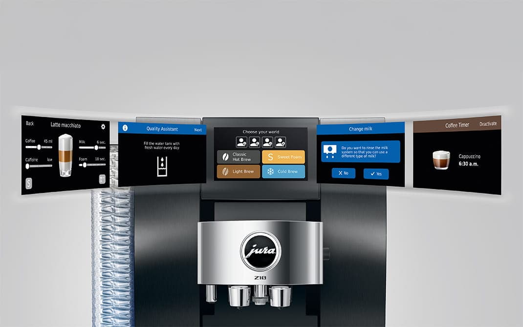 Die Z10 weckt Besitzfreude und erfüllt alle Ansprüche an einen Designklassiker: Sie zeichnet sich durch Spitzenqualität, zeitlose Eleganz und kompromisslose Funktionalität aus. Ihr edles Wellendesign akzentuiert den Wassertank und formt die Frontseite konvex-konkav. Das nach außen gewölbte Bedienfeld lädt zum Interagieren ein, während die Tassenplattform eine imposante Bühne bildet. Dank der Ausrichtung im idealen Winkel entfaltet das 4,3-Zoll-Farbdisplay seine volle Brillanz und bringt die Genusswelten zum Leuchten. Wer die Z10 betrachtet, entdeckt in jedem Detail die Liebe zum Design.