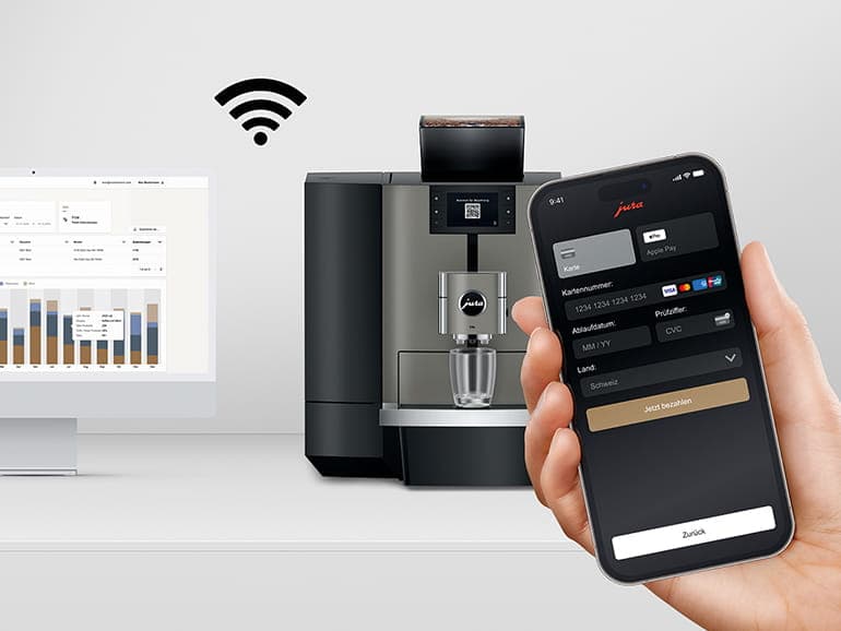Die kostenlose Software Pocket Pilot 3.0 von JURA bietet die Möglichkeit des kontaktlosen Bezahlens und präsentiert sich mit einem benutzerfreundlichen Abrechnungs- und Verwaltungssystem. Die X10c lässt sich ebenfalls mit der MDB-Schnittstelle von JURA ergänzen. Dadurch unterstützt sie die gängigsten Zahlungssysteme und ermöglicht größte Flexibilität und Einfachheit. Ob Kreditkarten-, Badge oder mobile Zahlungssysteme – die Wahl steht offen.
