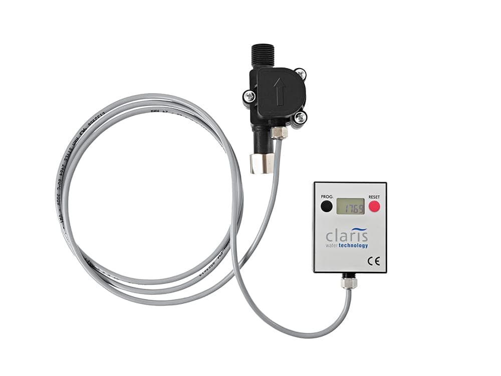 Der CLARIS Flow Sensor wurde speziell für die Kontrolle von Wasserfiltersystemen entwickelt. Nach Eingabe der Ausgangskapazität des jeweiligen Filters misst der CLARIS-Flow Sensor die bezogene Filtratmenge und zeigt die noch zur Verfügung stehende Restkapazität an.